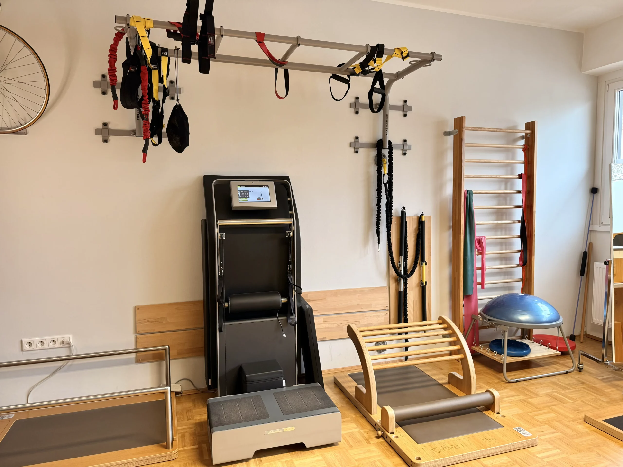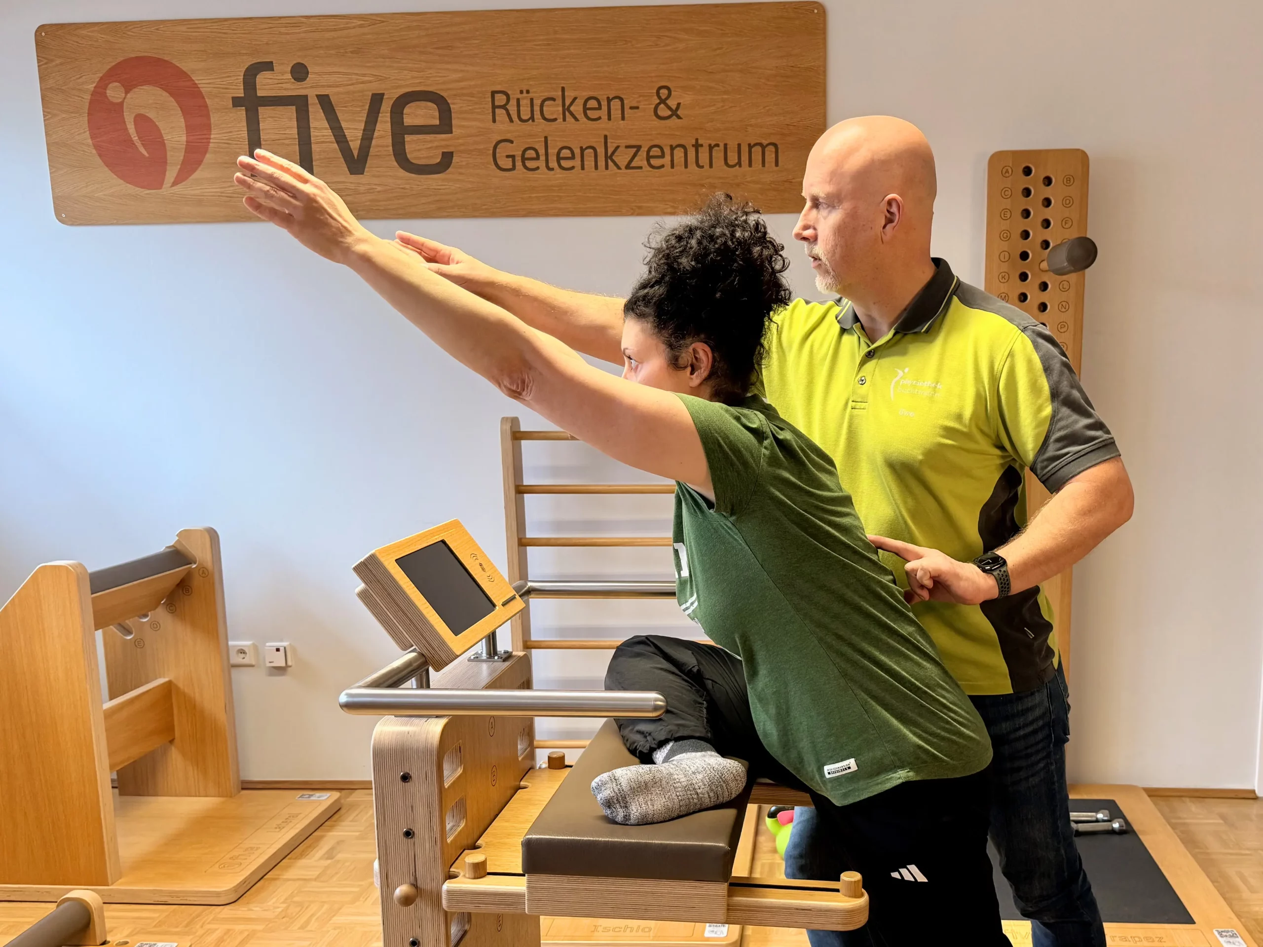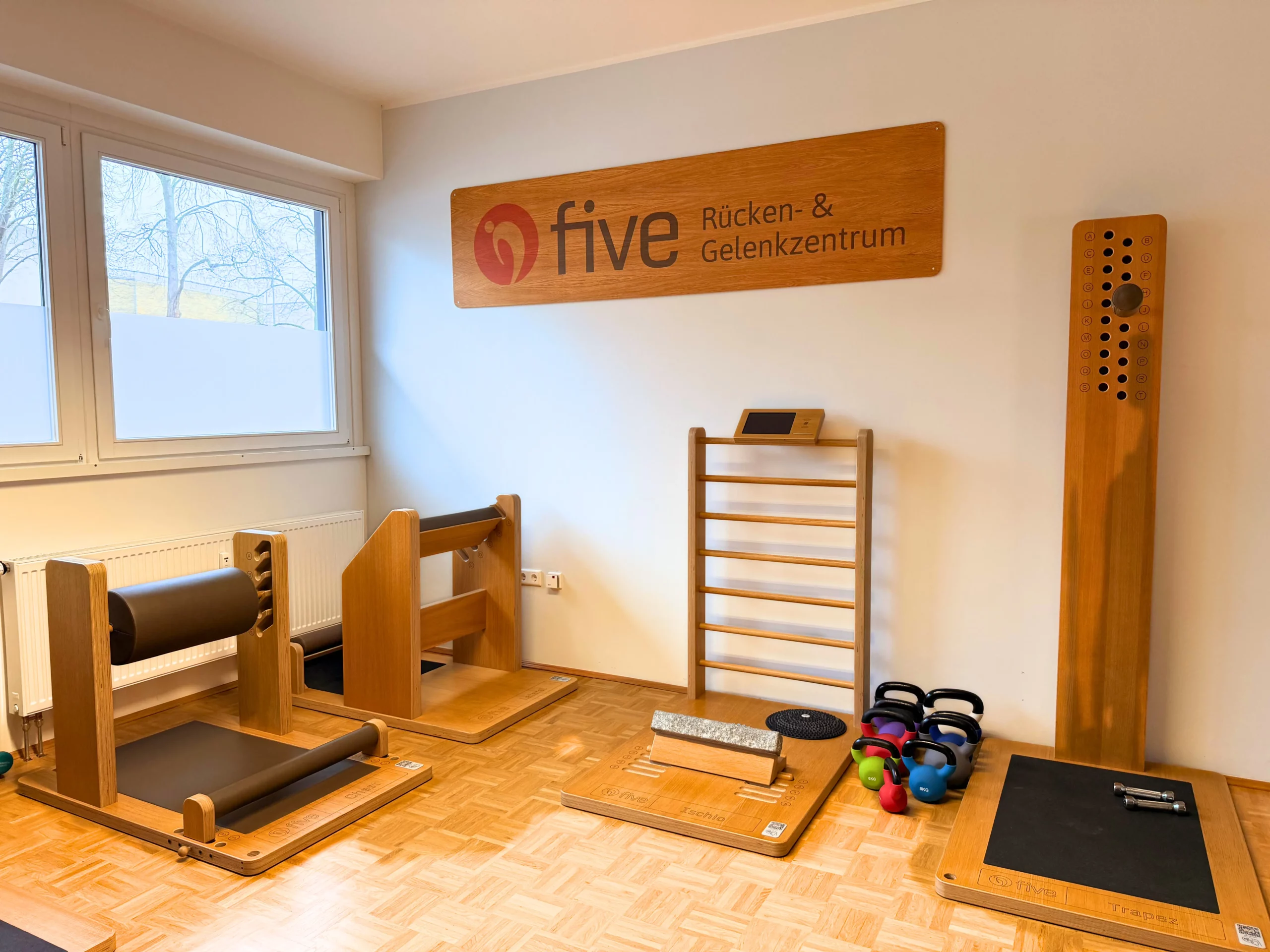 In der Physiothek arbeiten wir im Trainingsbereich mit Geräten von Five®. Die speziell entwickelten Holzgeräte ermöglichen ein geführtes, funktionelles Training mit Fokus auf Beweglichkeit, Muskelbalance und struktureller Aufrichtung.